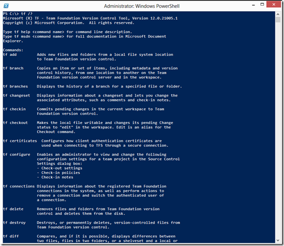 TfsManager is a project hosted on github by me. The idea came about this project when I was fiddling around with Team Foundation Server Object Model. Using the .dlls that are provided as part of Visual Studio installation or Team Explorer, you can pretty much do anything with TFS using code. I wanted to explore what I can do with that Object Model. At first sight these PowerShell cmdlets don’t seem to solve a significant problem that can’t be solved with traditional GUI or TF.exe. But let’s hold on to that thought for a while. Let’s get started.